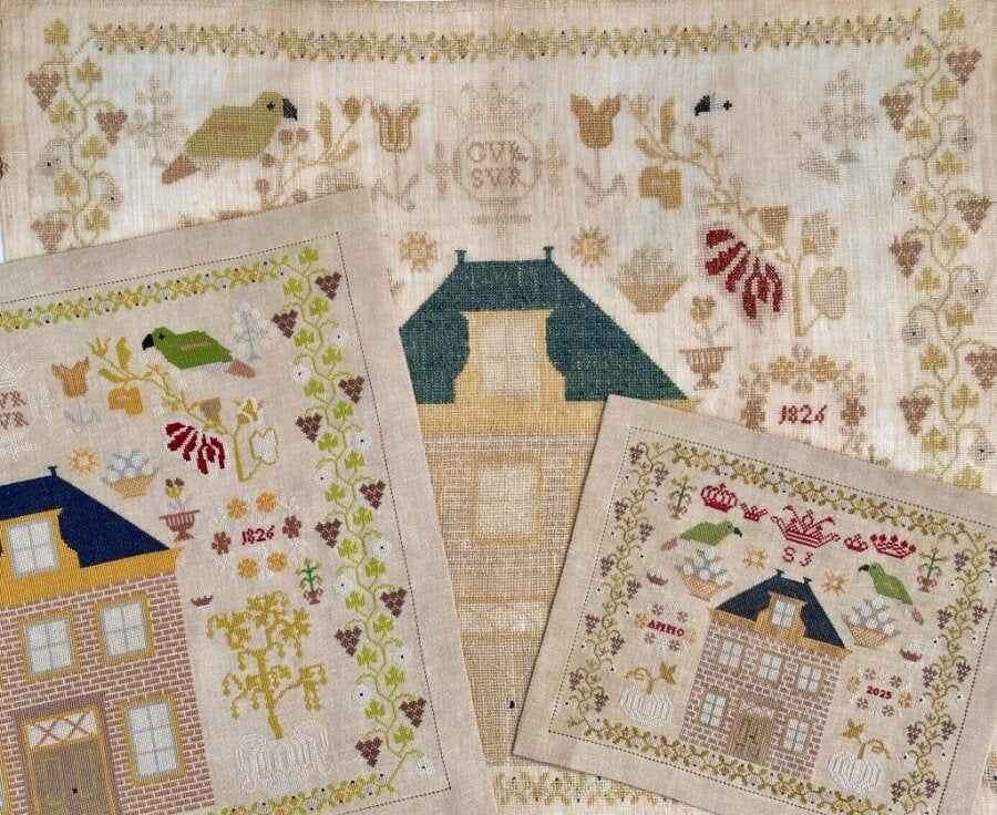 An impressive reproduction of an antique 1826 sampler, featuring a large house, colourful motifs, and elegant details. This new pattern book includes both the full original sampler and a smaller, modern adaptation. Thread options are provided for silks, DMC, and hand-dyed threads.