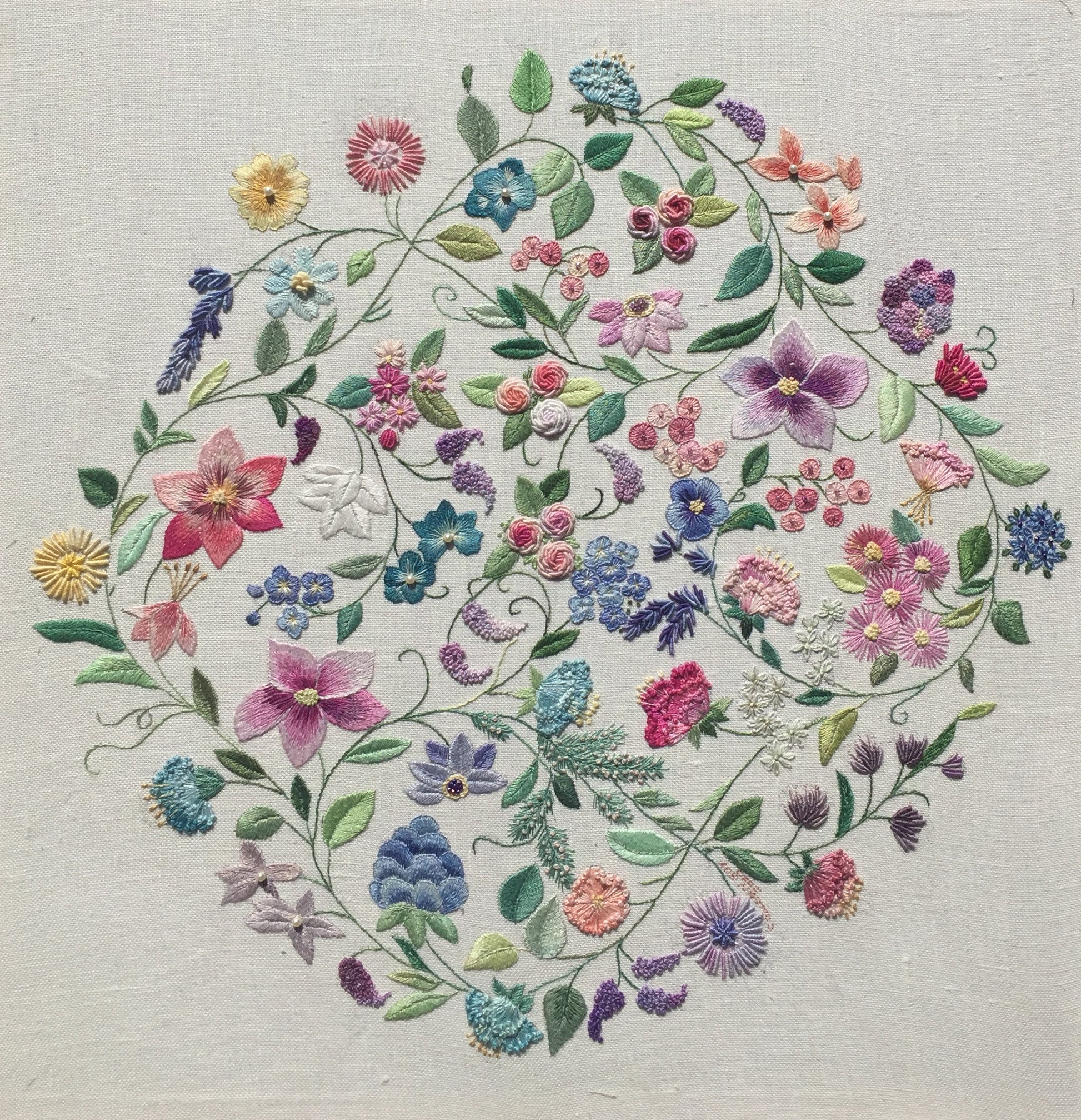 Designed by Colleen Goy ~ Cascade is a beautiful profusion of heavenly shaded flowers; a celebration of beauty in the world; encircled with vines and leaves all in heavenly shades. The design uses stranded floss – conversions given.