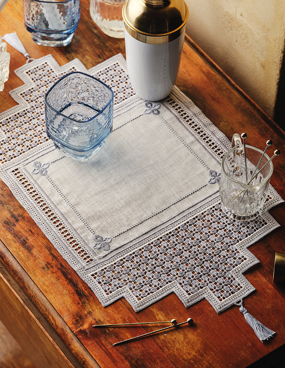 Table mat featuring the petal shapes created in the withdrawn thread embroidery named for a Sicilian town.