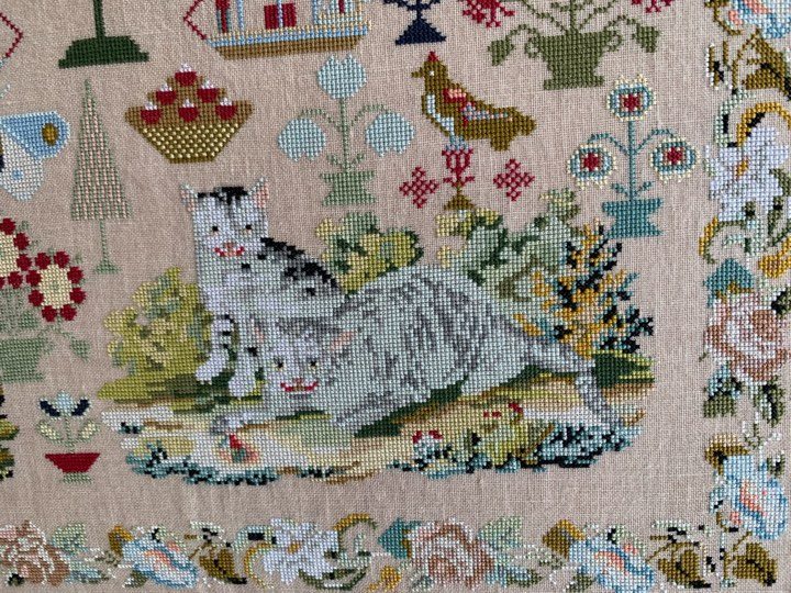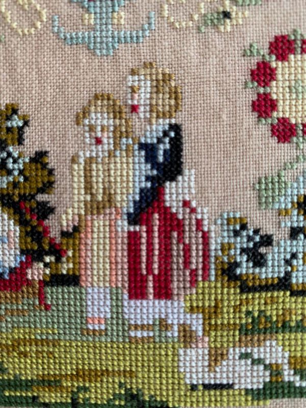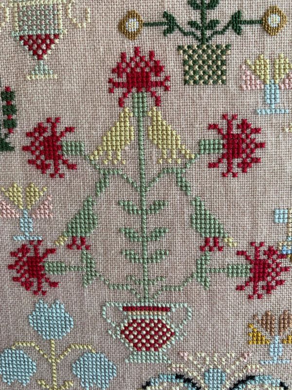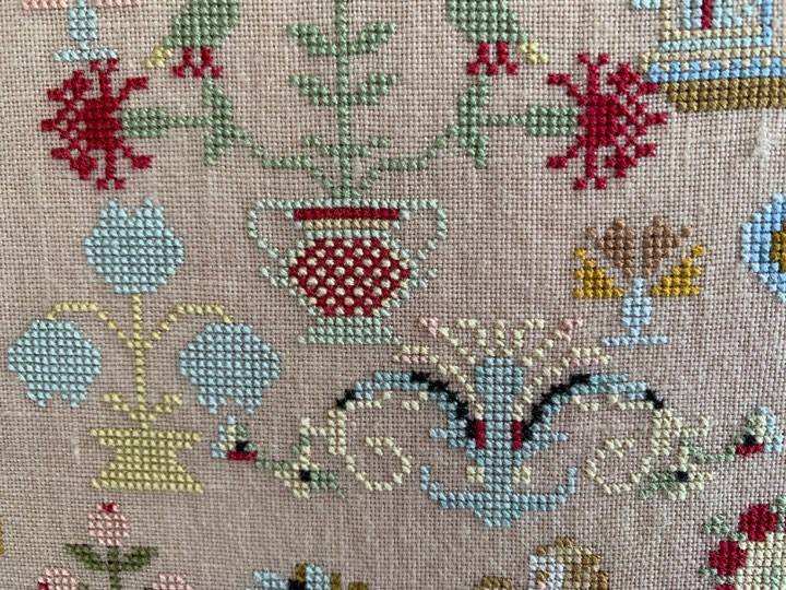 Jane’s beautiful Welsh sampler is a delight for the eye, the more you look at her the more you will see! With a wonderful palette of 32 colours Jane filled her sampler with traditional Welsh motifs contained within a stunning floral border. Roses, lilies and convolvulus in full bloom graciously sweep around this beautiful sampler. Jane diligently stitched pretty vases of flowers such as Ragged Robins from the Lychnis family, and Auriculas in the Primula family, two sailings ships, birds and butterflies abound, and two beautiful bowls of fruit.